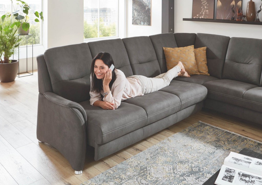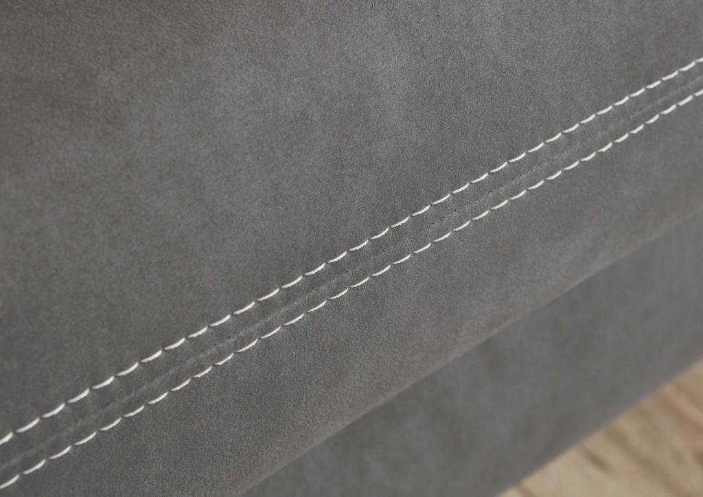 Microfaser, 100% Polyester, Farbe anthrazit, Doppelsteppnaht mit Kontrastfaden beige, Rücken echt, Sitz Boxspring, Metallfuß chromfarbig, Sitzhöhe ca. 49 cm, Sitztiefe ca. 54 cm, bestehend aus: