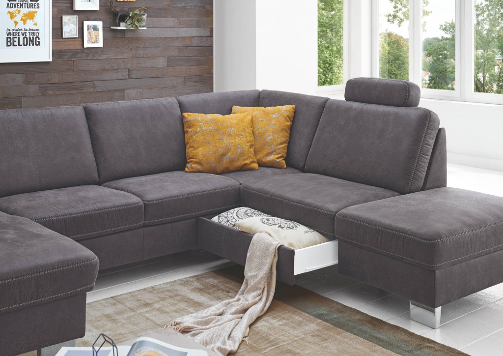 1,5-Sitzer Kombielement mit Schubkasten und Anstellhocker aufklappbar rechts, Rücken echt, 1x Kopfstütze, BHT ca. 87/90/235 cm