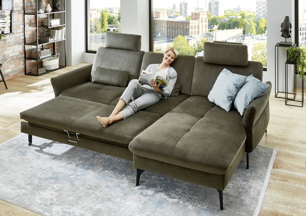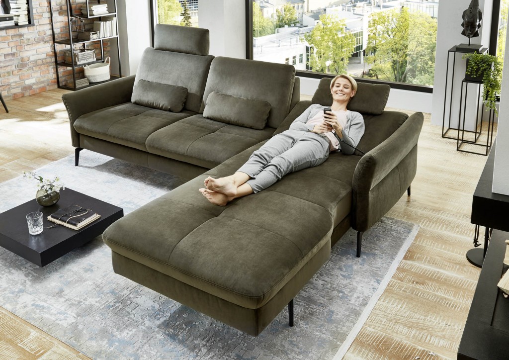 Polyestervelour gestrickt, Nutzschicht 100% Polyester, Grundschicht 90% Polyester, 10% Baumwolle, Farbe olive, Liegearmlehne, Sitz Kaltschaum, Rücken echt, Winkelfuß Metall schwarz, Sitzhöhe 47 cm, Sitztiefe 53/68 cm, bestehend aus: